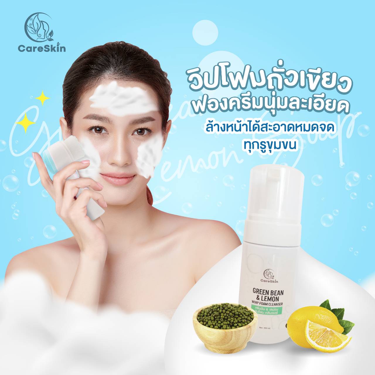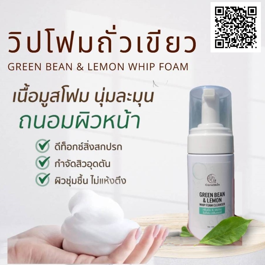CareSkin GreenBean & Lemon Whip Foam Cleanserวิปโฟมล้างหน้าชนิดอ่อนโยนต่อผิว++🌱 💚วิปโฟมถั่วเขียว ผลิตภัณฑ์จากถั่วเขียวออร์แกนิค เลม่อนและ ดาวเรือง วิปโฟมล้างหน้าธรรมชาติช่วยล้างสารพิษ สิ่งตกค้างที่อยู่ในรูขุมขน สิวเสี้ยนสิวหัวดำ ผิวหน้าสะอาดเกลี้ยง ไม่ว่าจะเป็นมลภาวะ ฝุ่นควัน หรือแม้แต่เครื่องสำอางค์ ที่สำคัญช่วยกระชับรูขุมขนปรับผิวขาวกระจางใสในครั้งแรกอีกด้วย