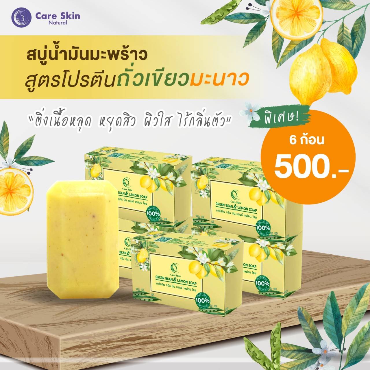 สบู่น้ำมันมะพร้าวสูตรโปรตีนถั่วเขียวมะนาว 6 ก้อน พิเศษ 500.-(ส่งฟรี)